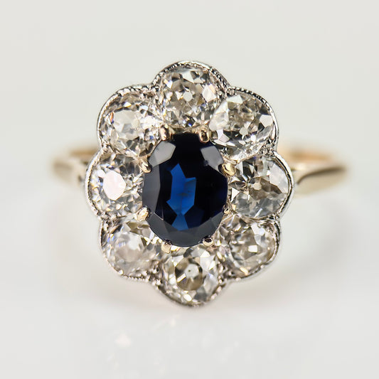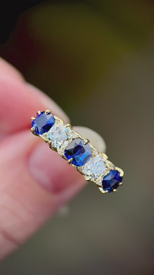 18ct Gold Antique Victorian 1.5ct Sapphire & 1ct Old Cut Diamond Five Stone Ring