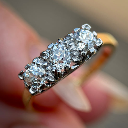 18ct Gold & Platinum Antique 0.75ct Old Cut Diamond Three Stone Trilogy Ring