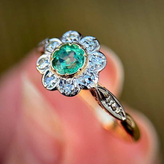 18CT Gold & Platinum Edwardian 0.40ct Emerald & 0.20ct Diamond Daisy Cluster Ring