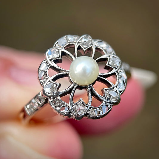 18CT Gold Antique Art Nouveau Old rose cut diamond & pearl floral flower ring