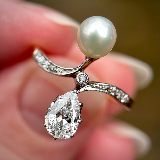 18CT Gold Antique 0.80ct Pear Cut Diamond & Pearl Toi Et Moi ring