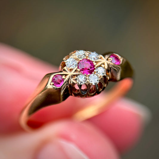18CT Gold Antique Ruby & Old Cut Diamond Cluster Ring Size R 1/2 2.9g