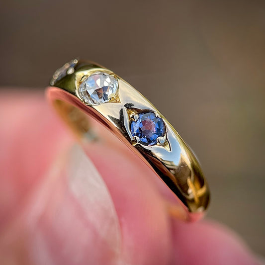 18ct Gold Antique Three Stone Old Cut Diamond & Sapphire Gypsy Ring Band