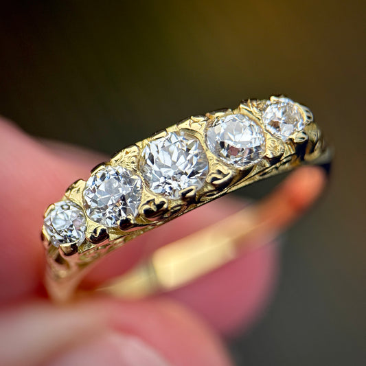 18ct Gold Antique 1.15ct Old Cut Diamond Five Stone Half Hoop Ring Size O