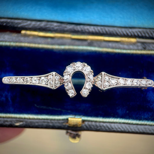 Antique Gold & Silver 1.00ct Old Cut Diamond Equestrian HorseShoe Brooch Bar Pin