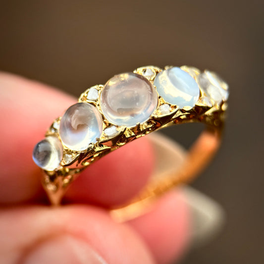 *RESERVED* + resize to a P 18ct Gold Antique Fully Hallmarked Moonstone & Old Cut Diamond Half Hoop Ring