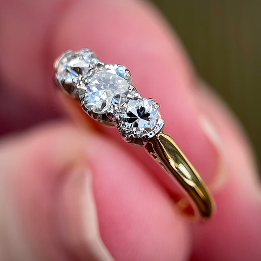 18ct Gold & Platinum Antique 0.70ct Old Cut Diamond Three Stone Trilogy Ring