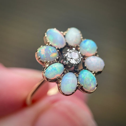 18CT Gold Antique Opal & Old cut diamond Flower Cluster Daisy Ring Size N 1/2