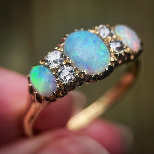 18CT Gold Large Antique Victorian Fiery Crystal Opal & Old Cut Diamond Ring
