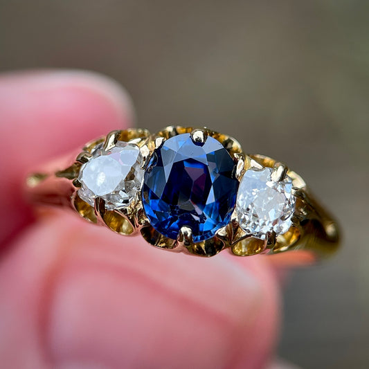 Antique Sapphire & Old Cut Diamond 3 Stone 18ct Yellow Gold Ring Size N