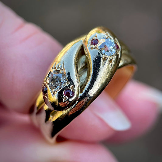 18CT Gold Antique Old Cut Diamond & Ruby Double Headed Snake Ring Heavy 9.6g