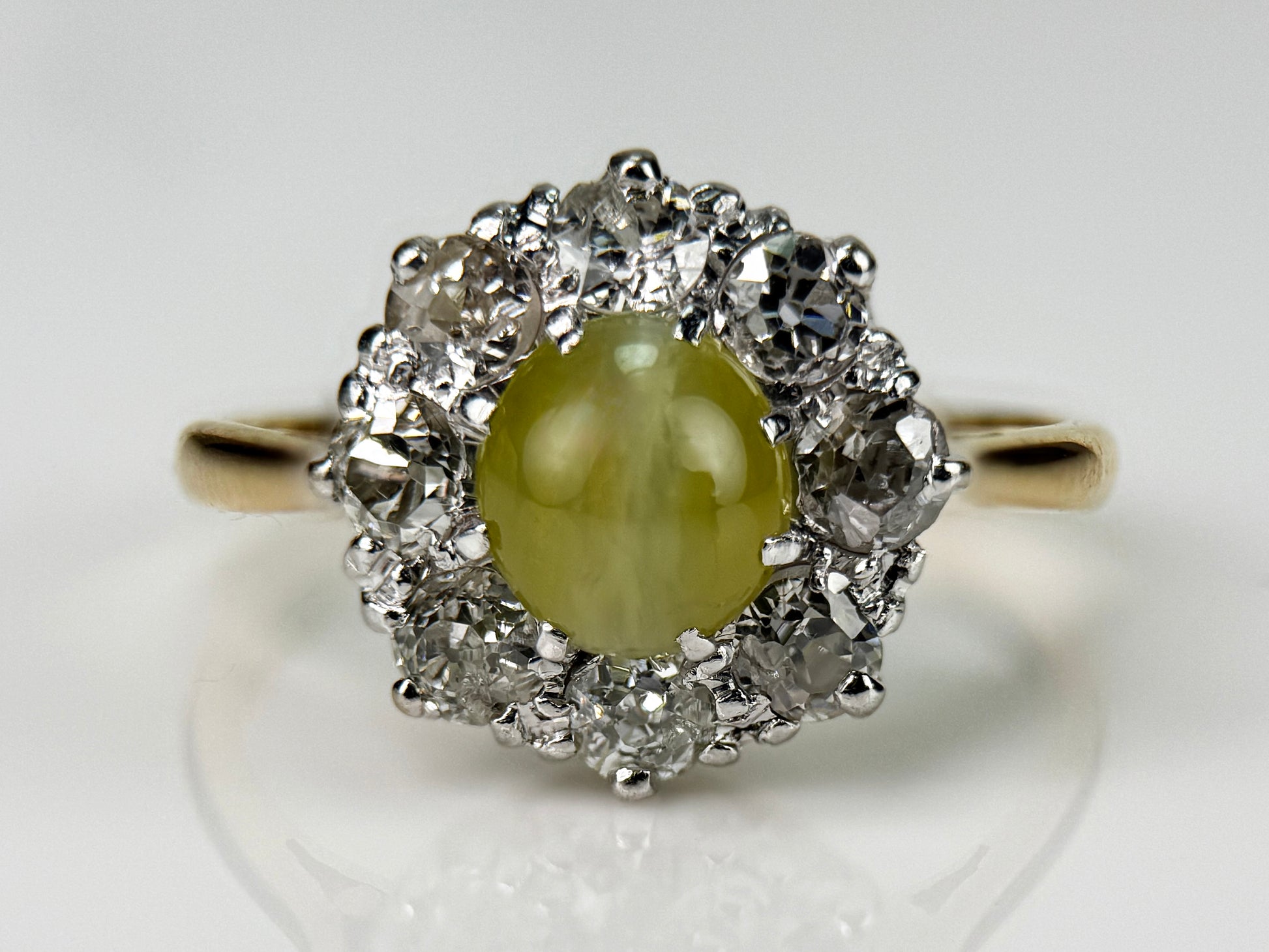 18CT Gold Antique Edwardian Cats Eye Chrysoberyl & Old Cut Diamond Cluster Ring