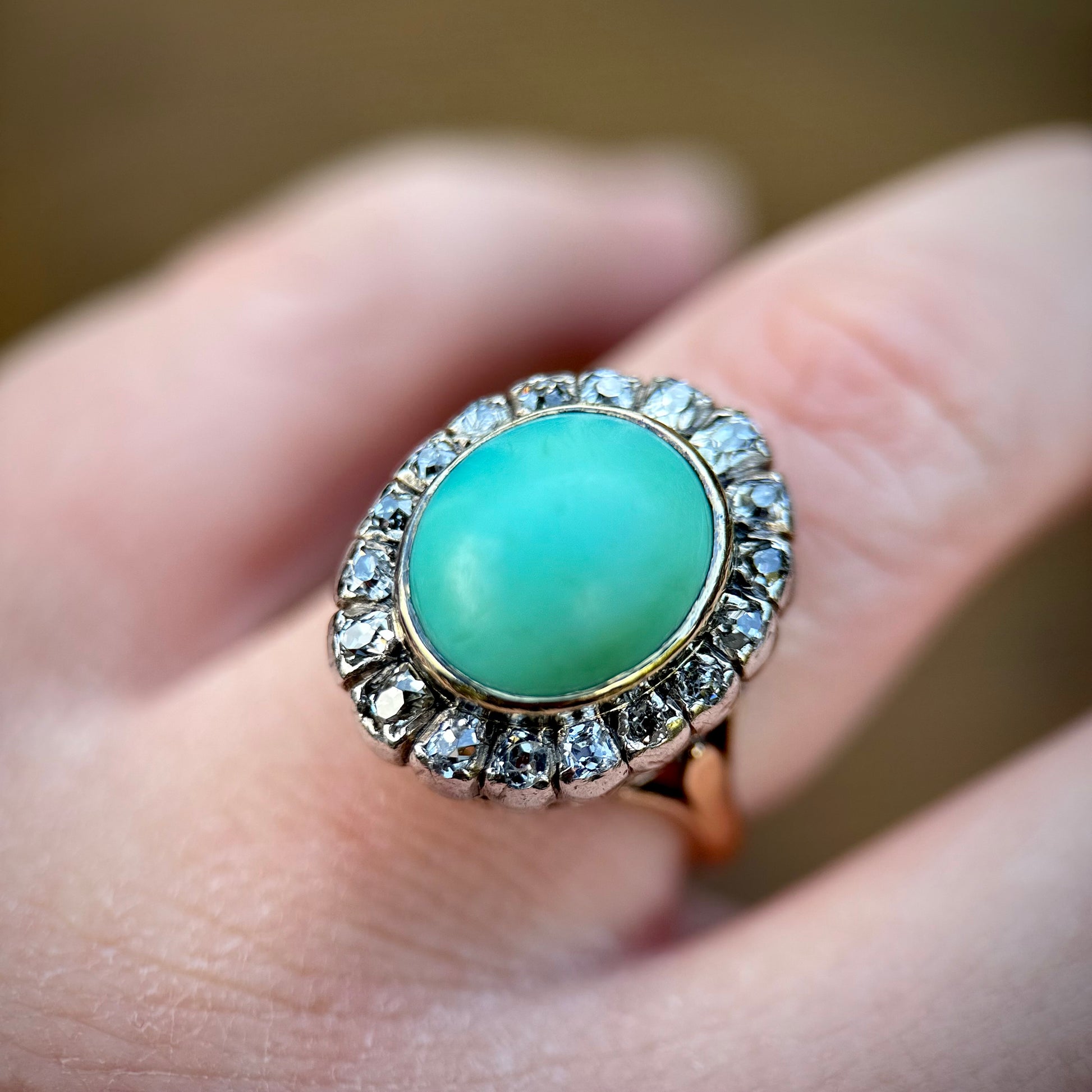 The Turquoise is surrounded by eighteen gorgeous glimmering old mine cut diamonds that appear bright, sparkly and well matched.