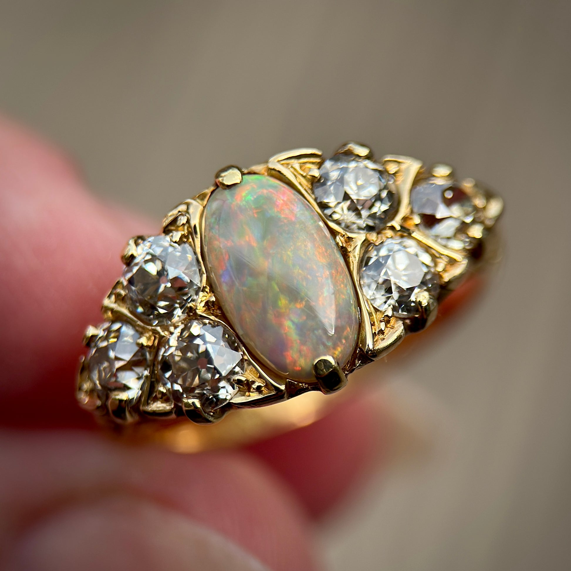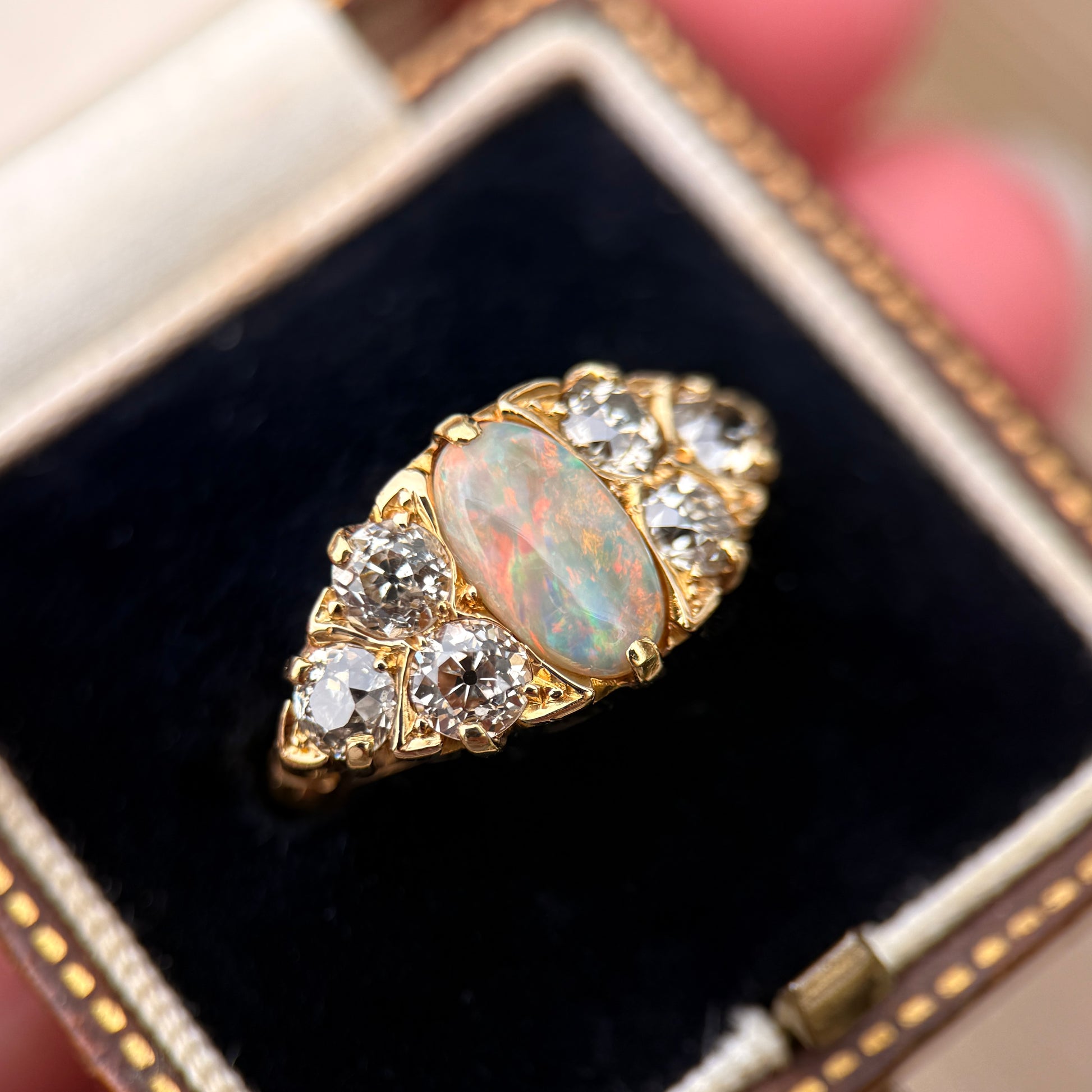 The opal is flanked by six gorgeous glimering, white old mine cut diamonds. Total diamond weight is approximately 1.20ct (6 x 0.20ct)