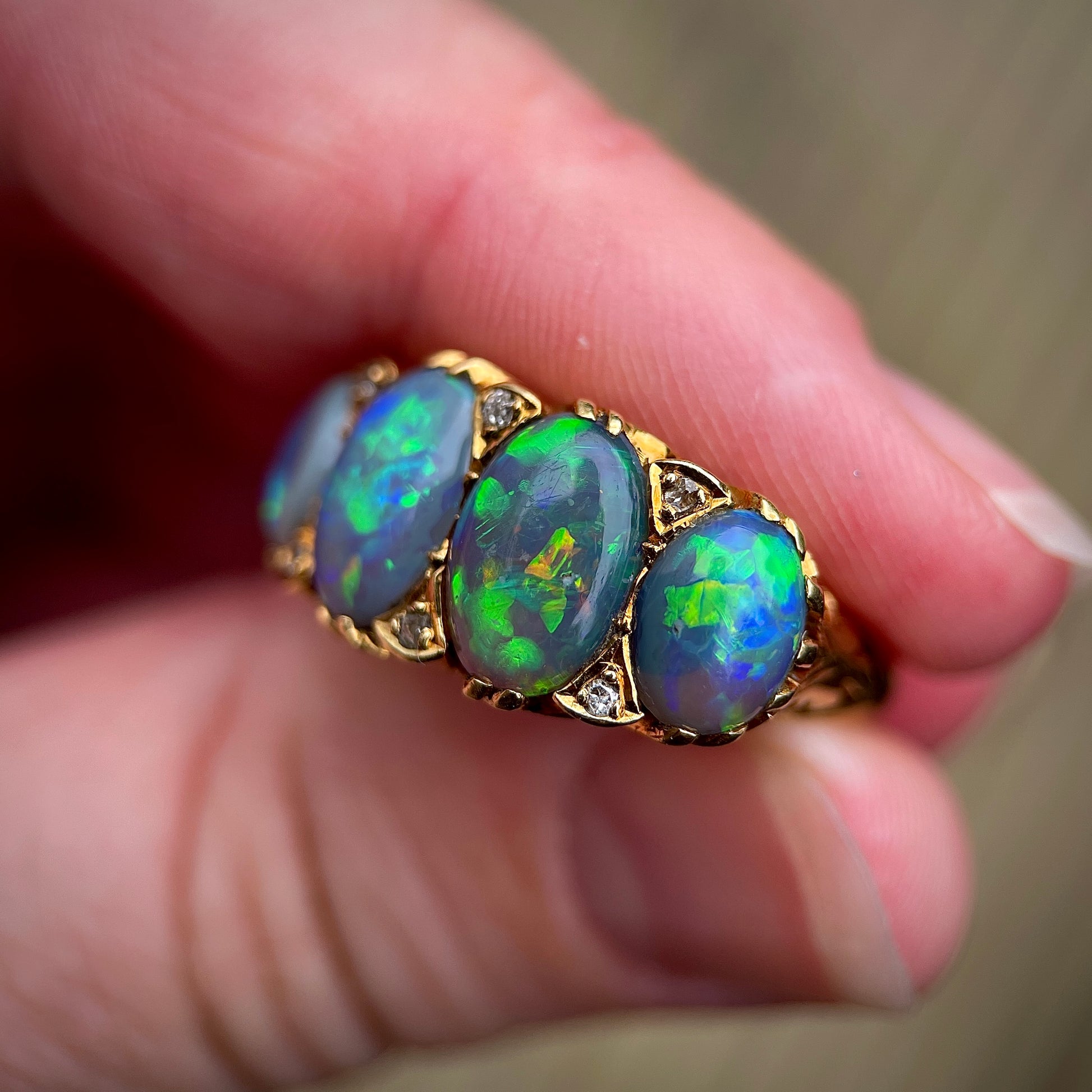 Found within this exquisite 18CT gold Opal & diamond ring are four large, natural Black crystal opals which display desirable vivid colour play