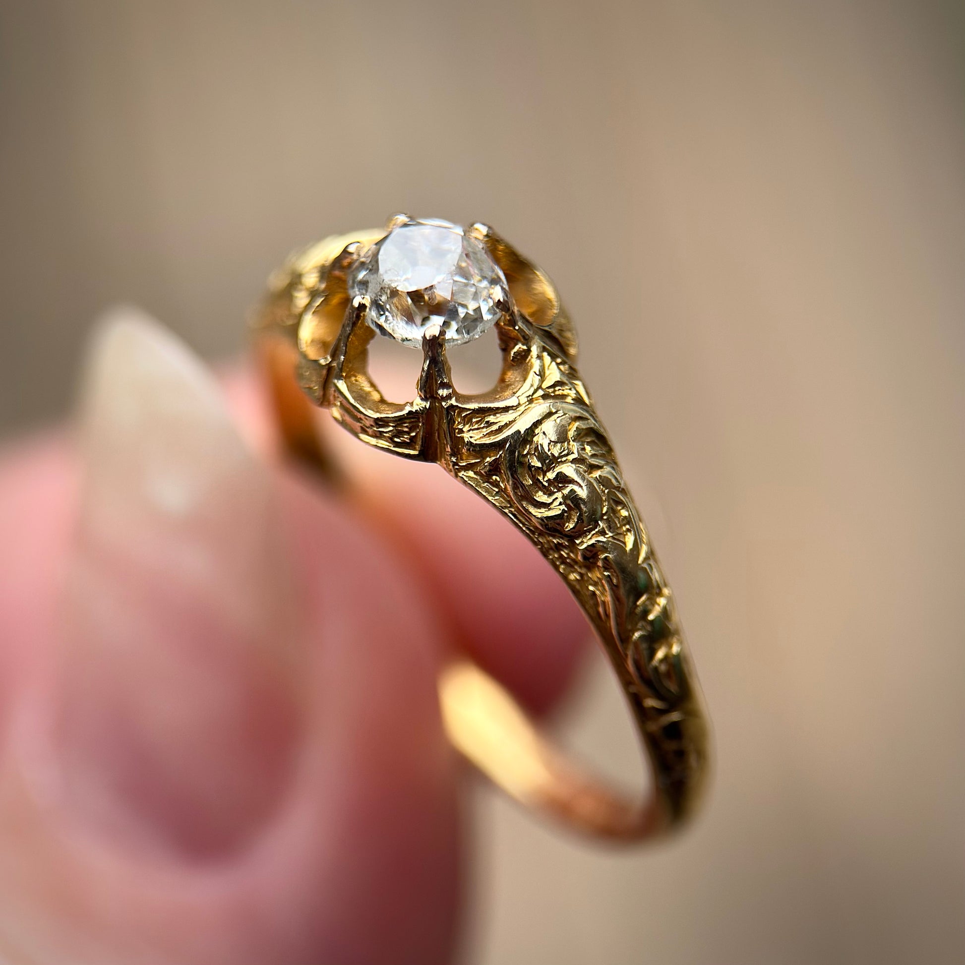This Antique Diamond gypsy ring features a bright, white old mine cut diamond, approximately 0.40ct (4.7mm x 4.1mm x 3.2mm), there are some natural inclusions and surface nibbles typical of antique stones, visible under 10x magnification and in the detailed images. The ring has gorgeous scroll detailing on the shoulders.